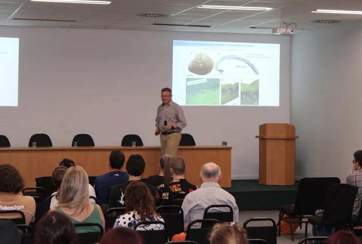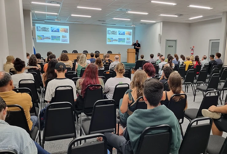 À noite, James Scourse (University of Exeter), Oliver Craig (University of York) e Bernd Schöne (University of Mainz) apresentaram o projeto "SeaChange" a estudantes de Ciências Biológicas e a mestrandos e doutorandos dos programas de Saúde e Meio Ambiente e Patrimônio Cultural e Sociedade.